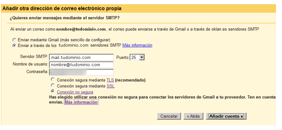 Gmail intentará configurar automáticamente la conexión con la cuenta externa. Si la configuración automática no funciona, es posible que debas proporcionar información adicional, como los puertos POP y SMTP y la configuración de seguridad. Estos detalles se pueden encontrar en la documentación o el sitio web del proveedor de correo electrónico de tu cuenta externa.