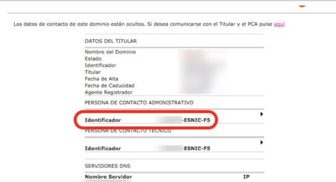 Después de pelearte con el Captcha, verás los datos del dominios, que no serán muchos debido a las normas Europeas de protección de datos, pero si tendrás acceso al Identificador del Dominio.